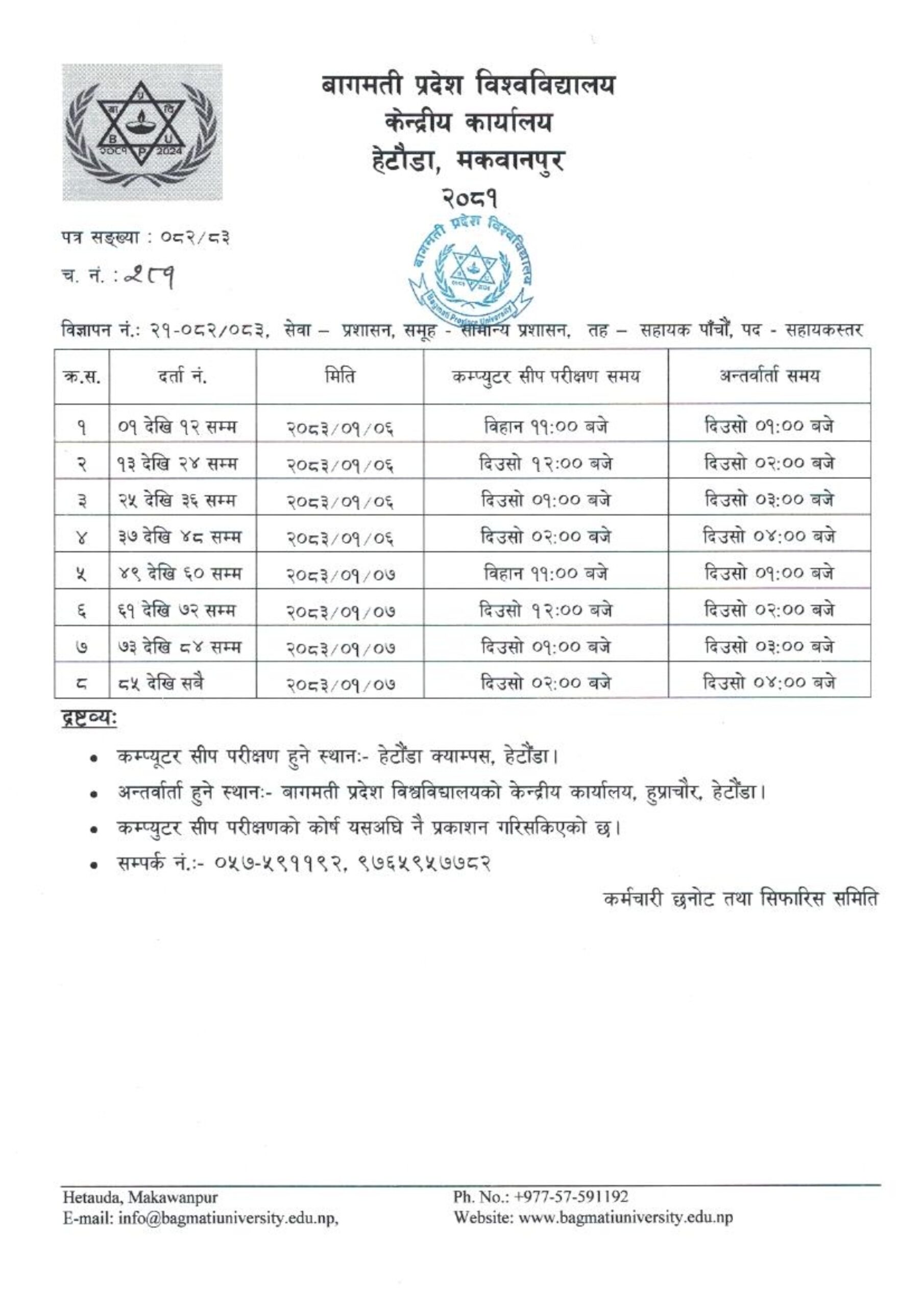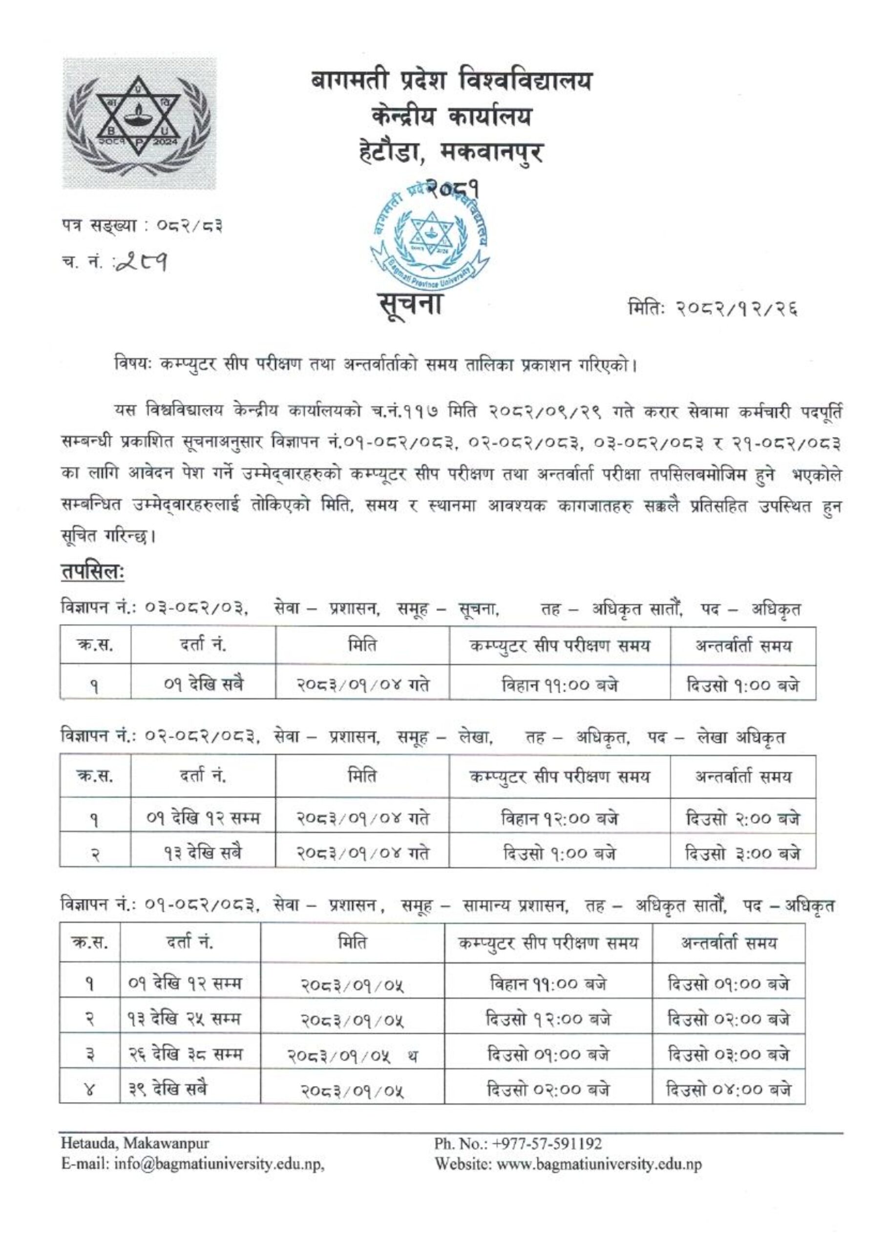 कम्प्युटर सीप परीक्षण तथा अन्तर्वार्ताको समय तालिका प्रकाशन गरिएको