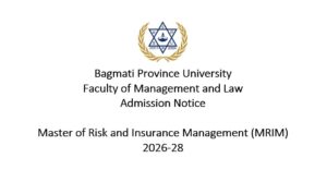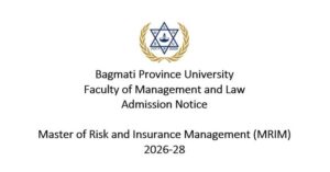 The Faculty of Management and Law, Bagmati Province University, invites applications from eligible candidates for admission to the Master of Risk and Insurance Management (MRIM) program. About the Program The MRIM program is a four-semester graduate program designed to develop highly skilled professionals in risk management, insurance, reinsurance, actuarial foundations, data analytics, and regulatory frameworks. The program integrates theory with practical exposure through practicum courses, industrial and educational excursions, a...