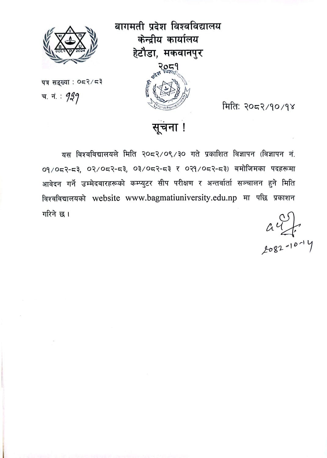 यस विश्वविद्यालयले मिति २०८२ / ०९ / ३० गते प्रकाशित विज्ञापन (विज्ञापन नं. ०१/०८२-८३, ०२/०८२-८३, ०३/ ०८२-८३ र ०२१/०८२-८३) बमोजिमका पदहरूमा आवेदन गर्ने उम्मेदवारहरूको कम्प्युटर सीप परीक्षण र अन्तर्वार्ता सञ्चालन हुने मिति विश्वविद्यालयको website www.bagmatiuniversity.edu.np मा पछि प्रकाशन गरिने छ ।
